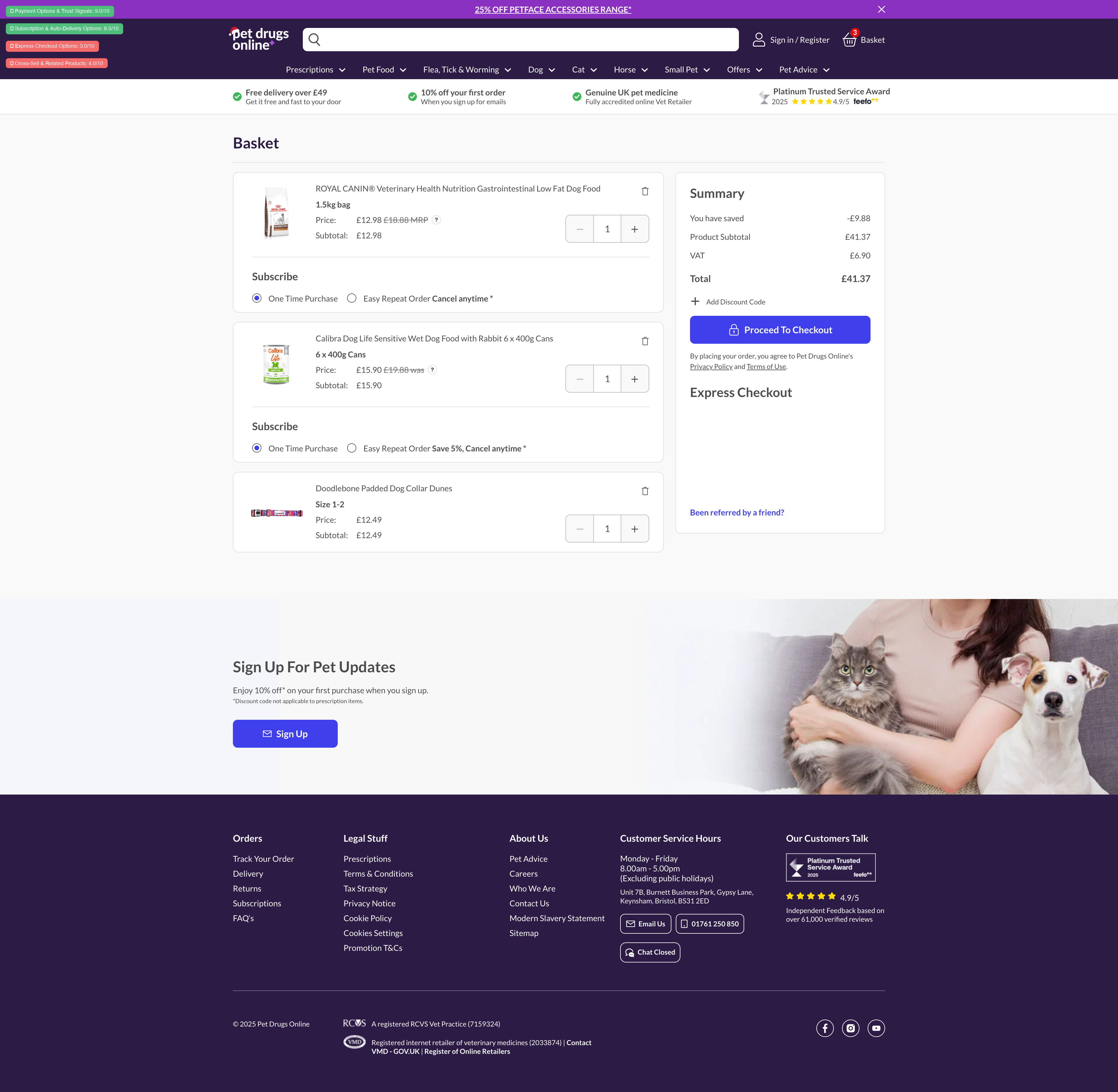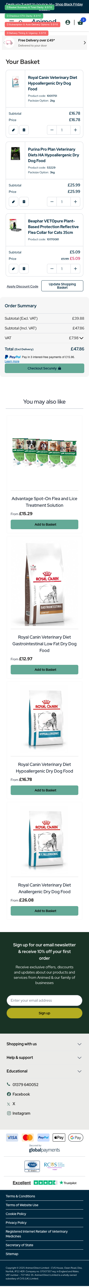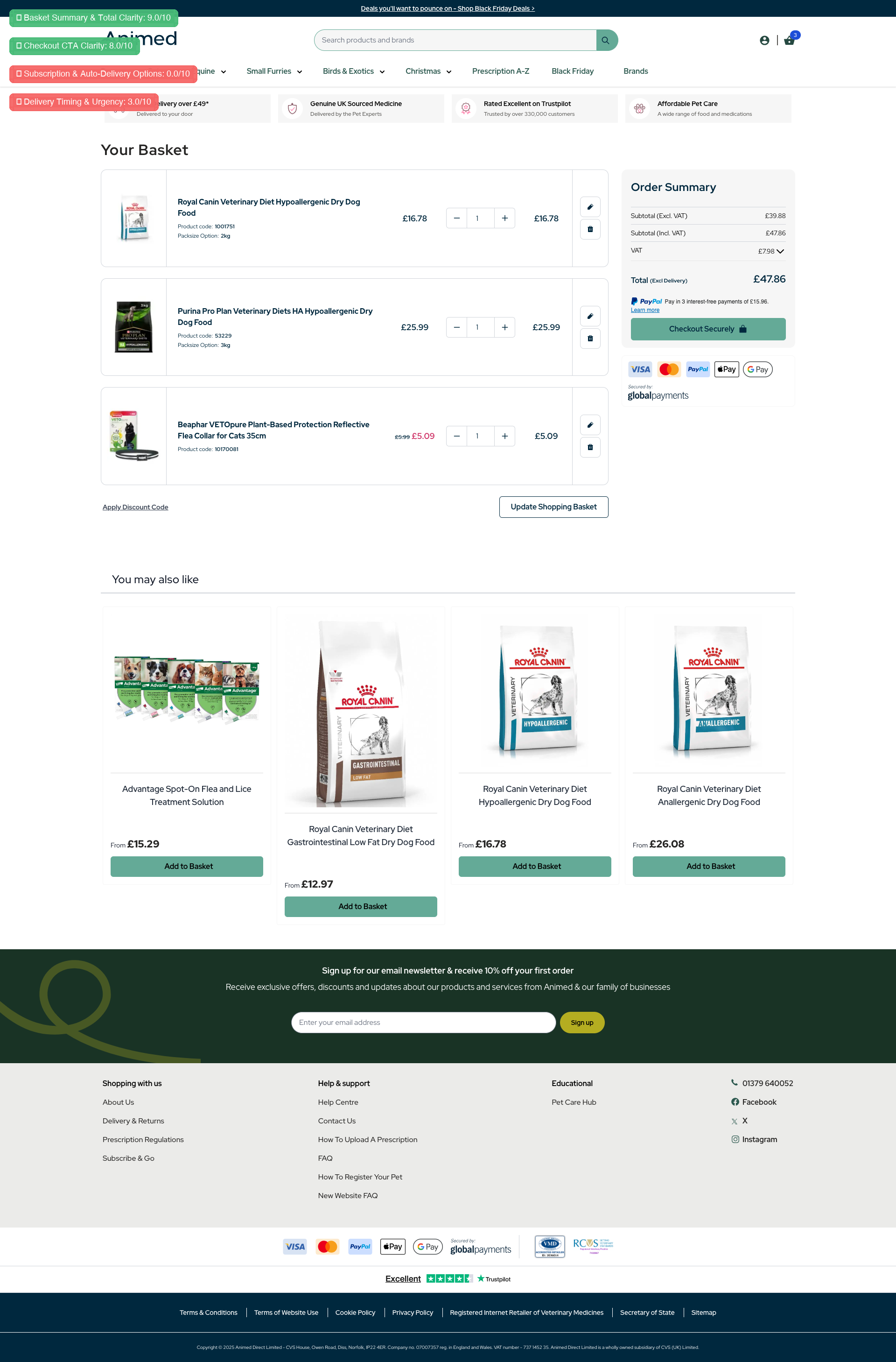 VioVet demonstrates solid fundamentals with clear pricing transparency and PayPal integration, but lacks modern convenience features like subscription options and express checkout that market leaders now offer. Their basket UX is functional but not differentiated.