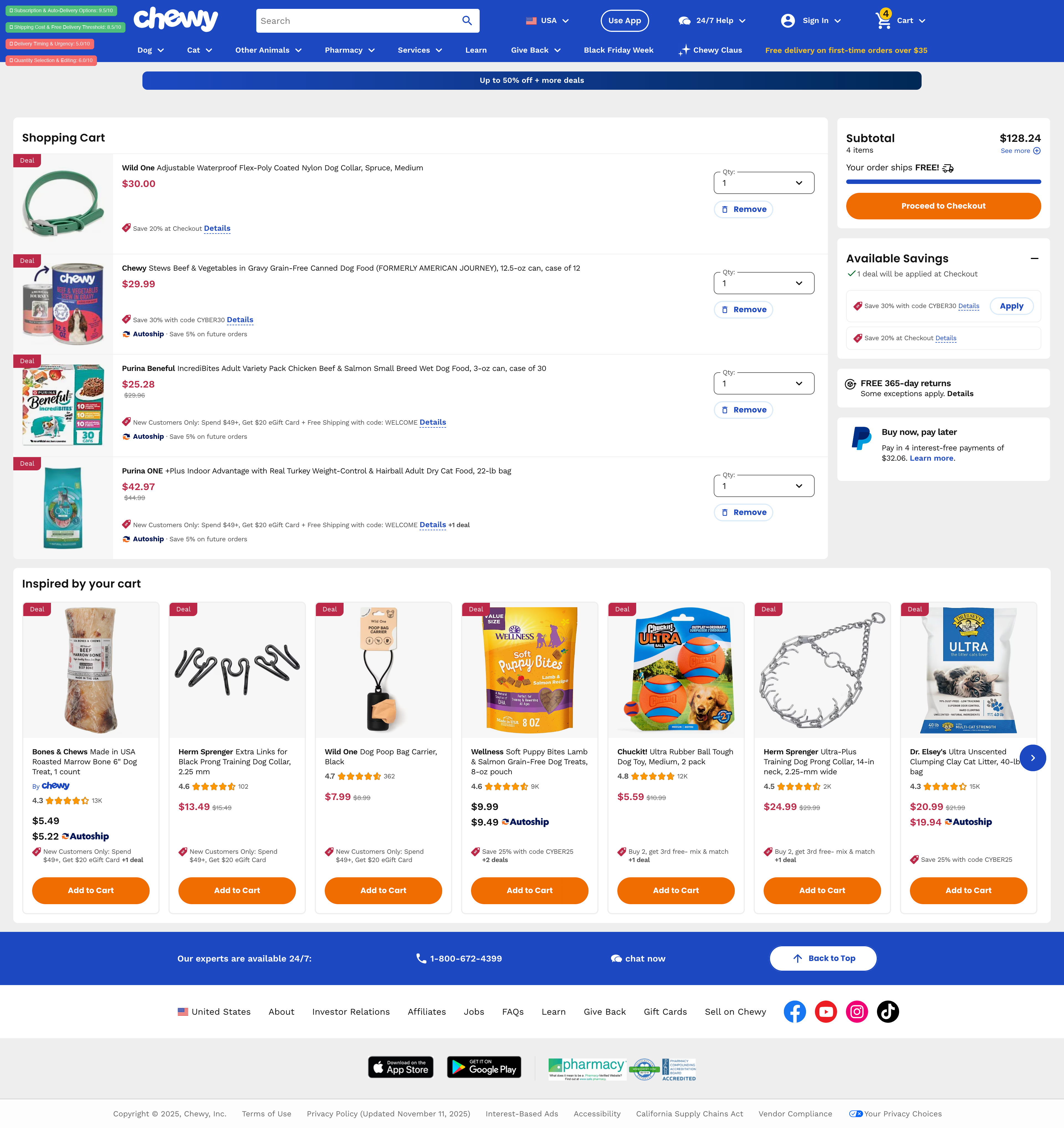 Amazon demonstrates strong baseline functionality with clear pricing and comprehensive product details, but lacks pet-specific subscription optimization and modern express checkout prominence that specialized pet retailers now offer.