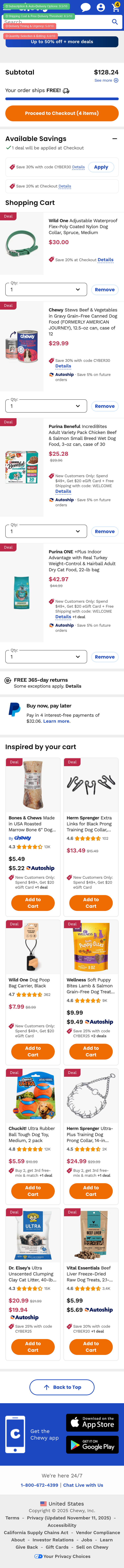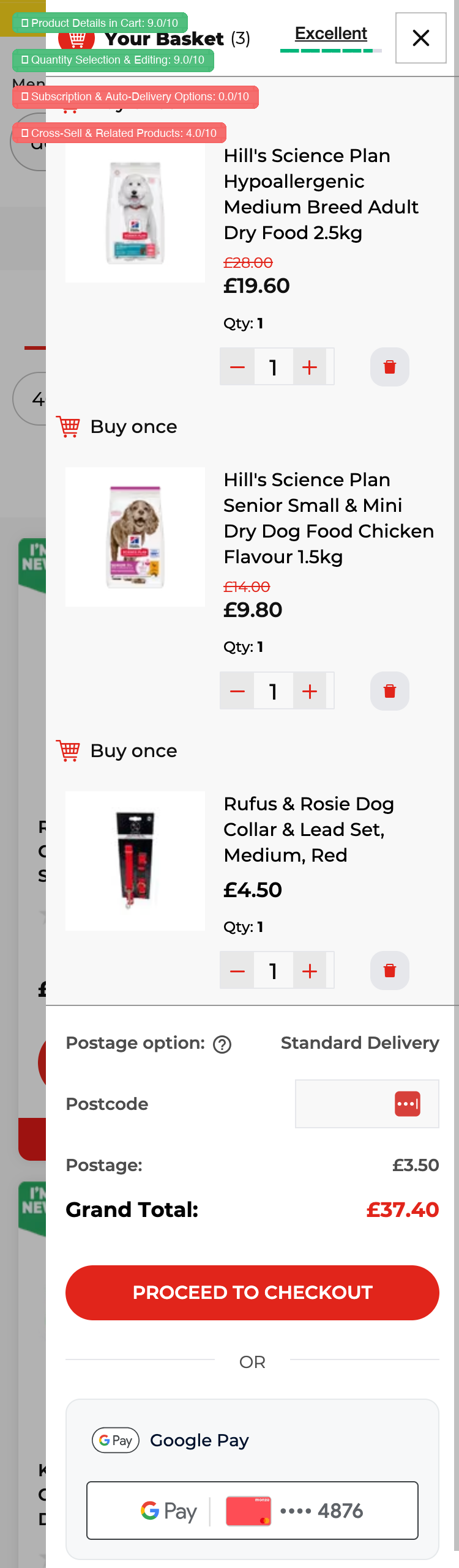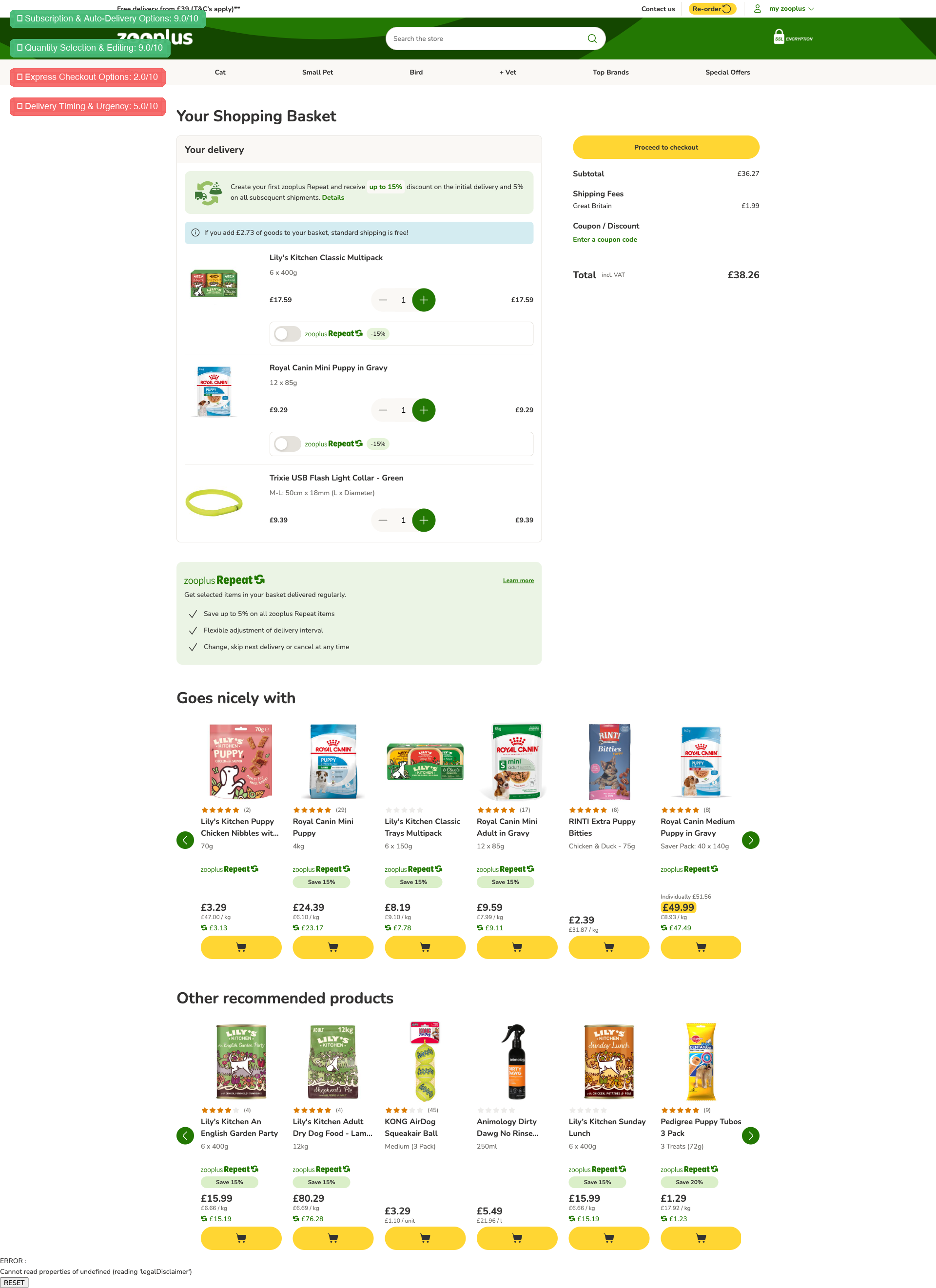 Chewy demonstrates strong core basket functionality with excellent subscription integration and savings visibility, but lacks critical UK-specific elements like VAT transparency and suffers from suboptimal mobile layout density that could impact conversion.