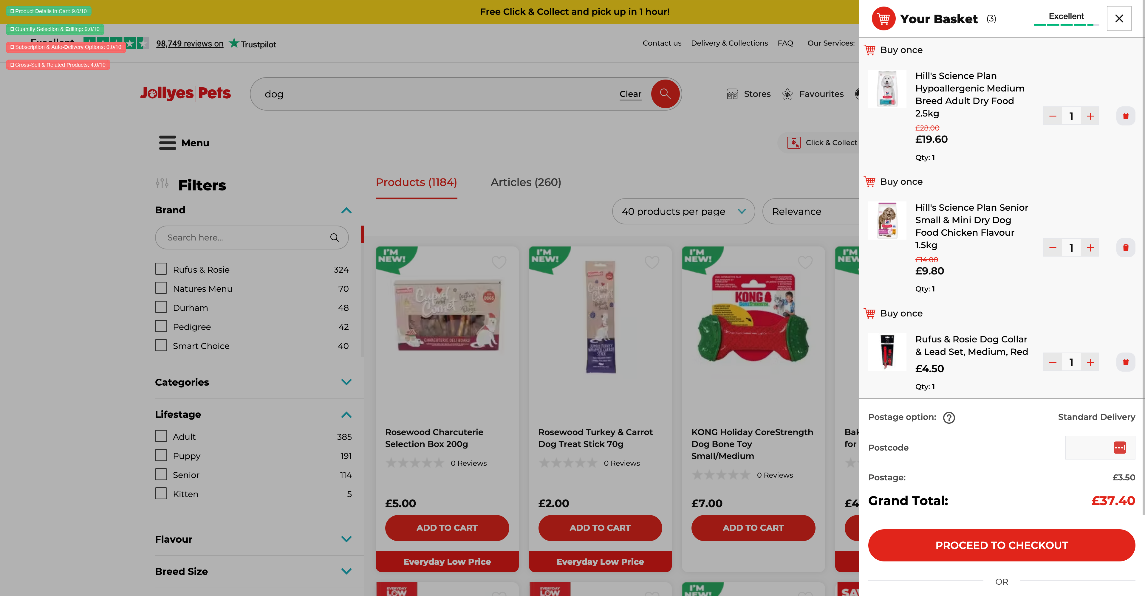 Jollyes demonstrates solid fundamentals with clear product details and decent mobile optimization, but lacks critical conversion features like subscription options and delivery cost transparency that market leaders leverage.