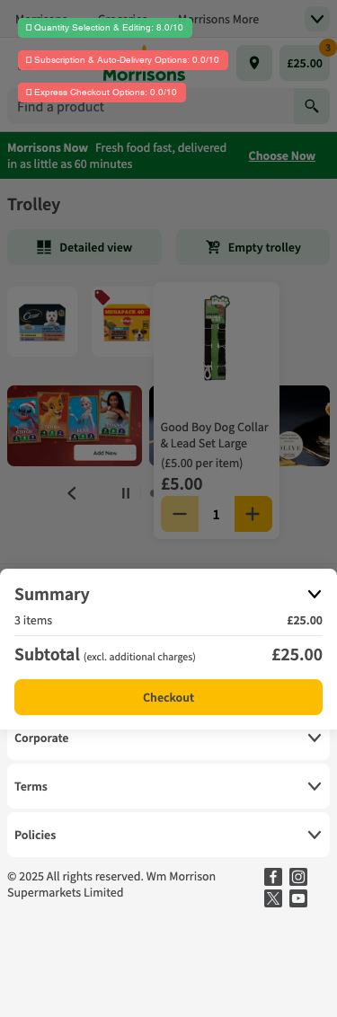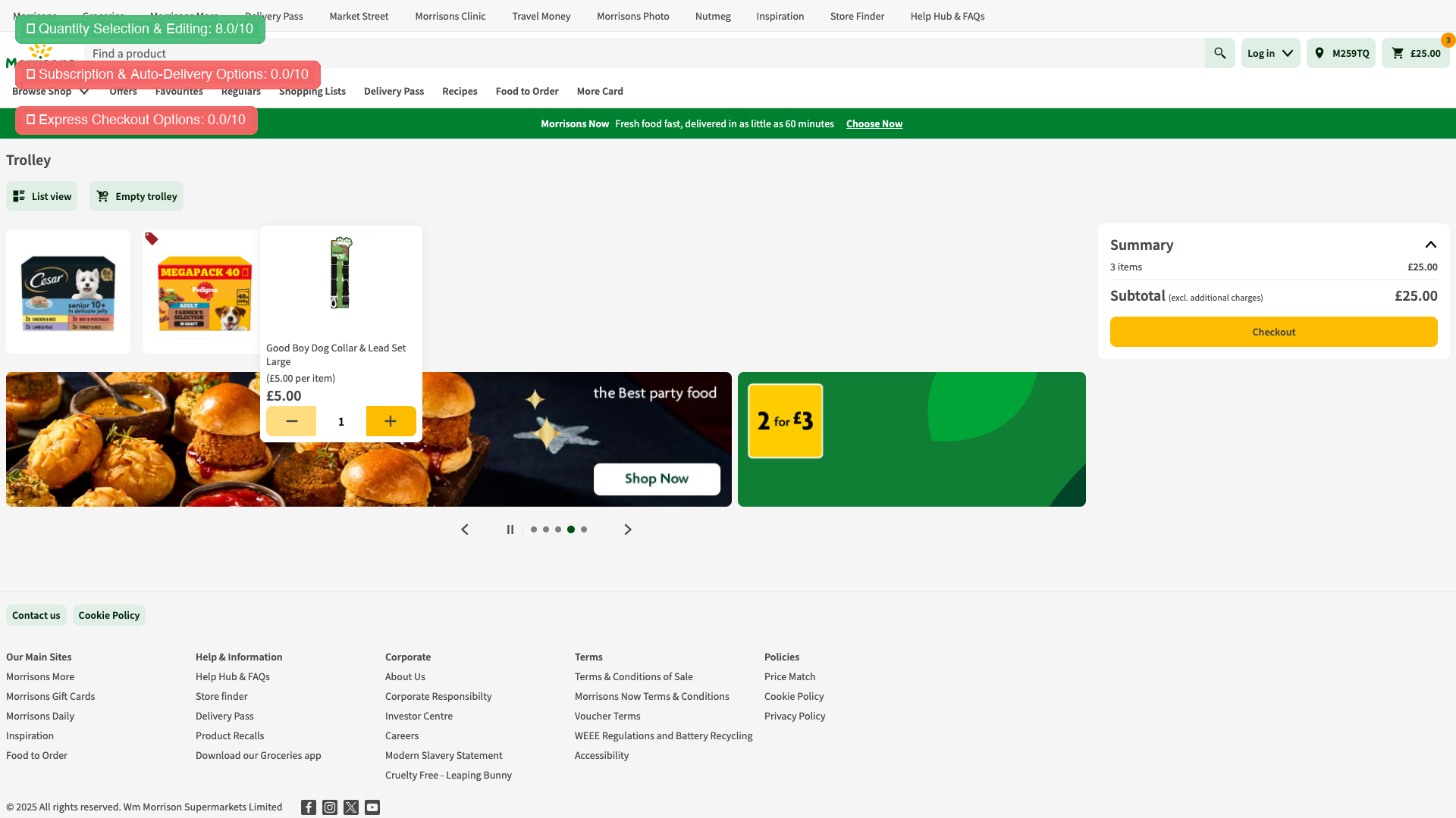 Morrisons presents a basic, functional basket experience that meets minimum requirements but lacks key competitive features for pet food retail, particularly subscription options and delivery transparency. Their implementation shows significant gaps against market leaders.