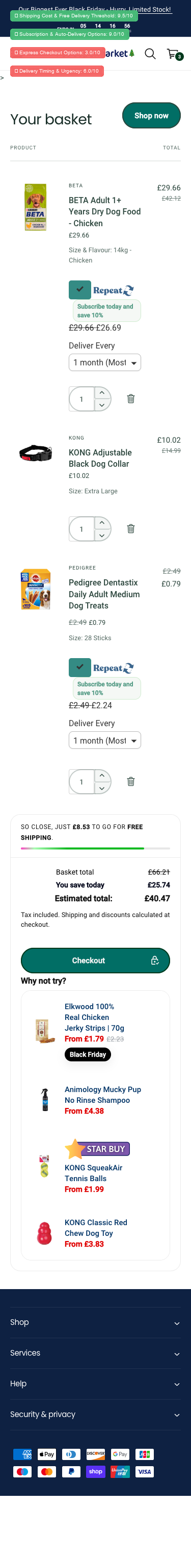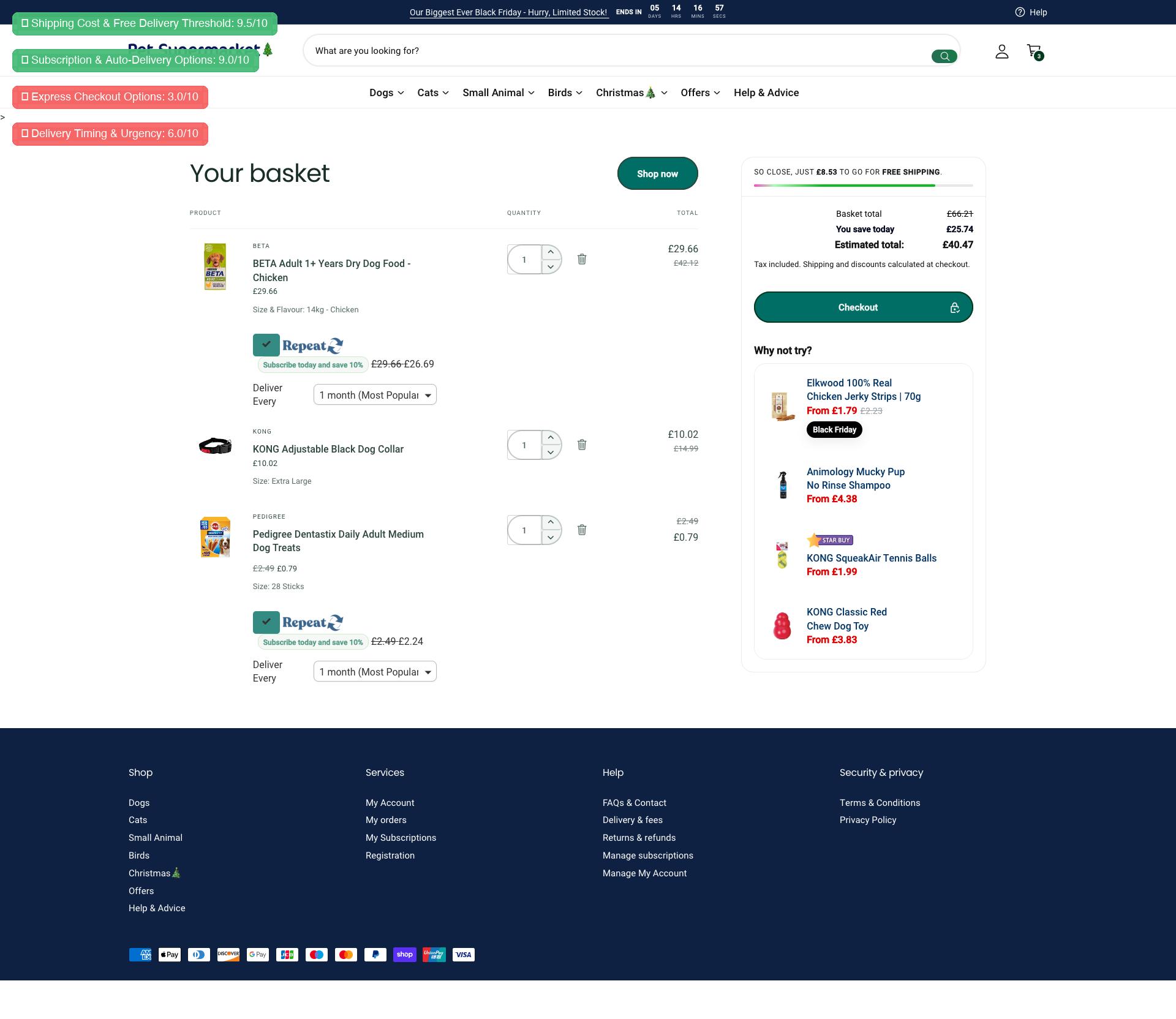 Pets Corner demonstrates solid basket page fundamentals with clear delivery thresholds and well-structured summary, but lacks critical subscription functionality and express checkout options that market leaders leverage for repeat purchase conversion.