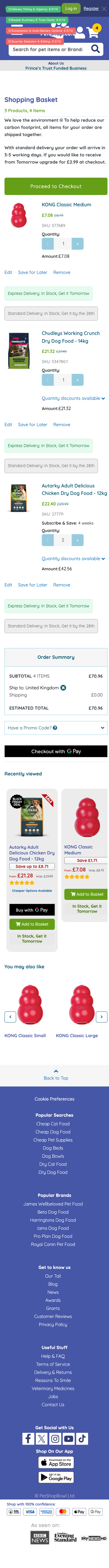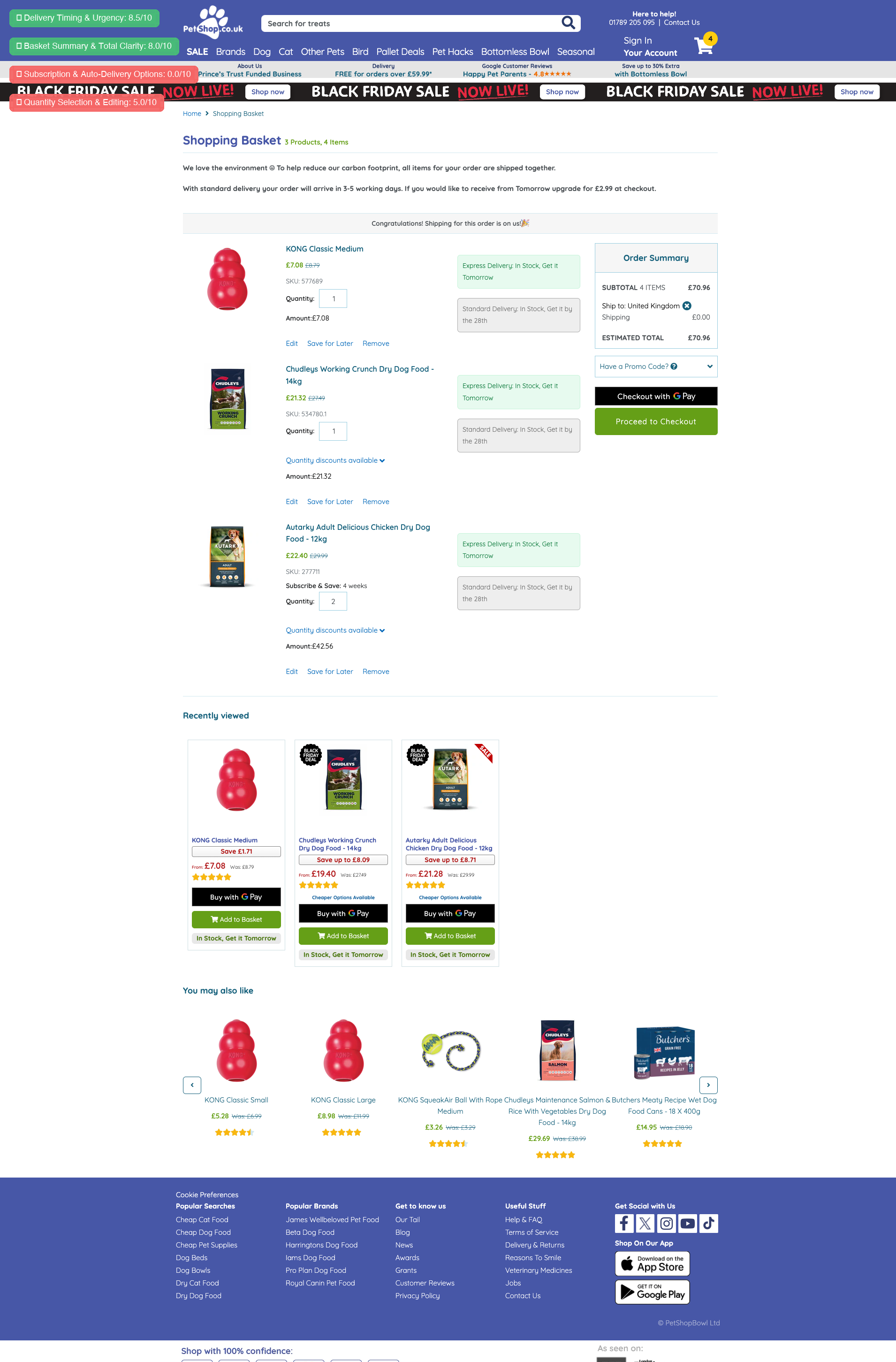 Pet Drugs Online demonstrates strong fundamentals with subscription integration and clear basket structure, but lacks modern express checkout options and has limited delivery urgency indicators that could impact conversion.