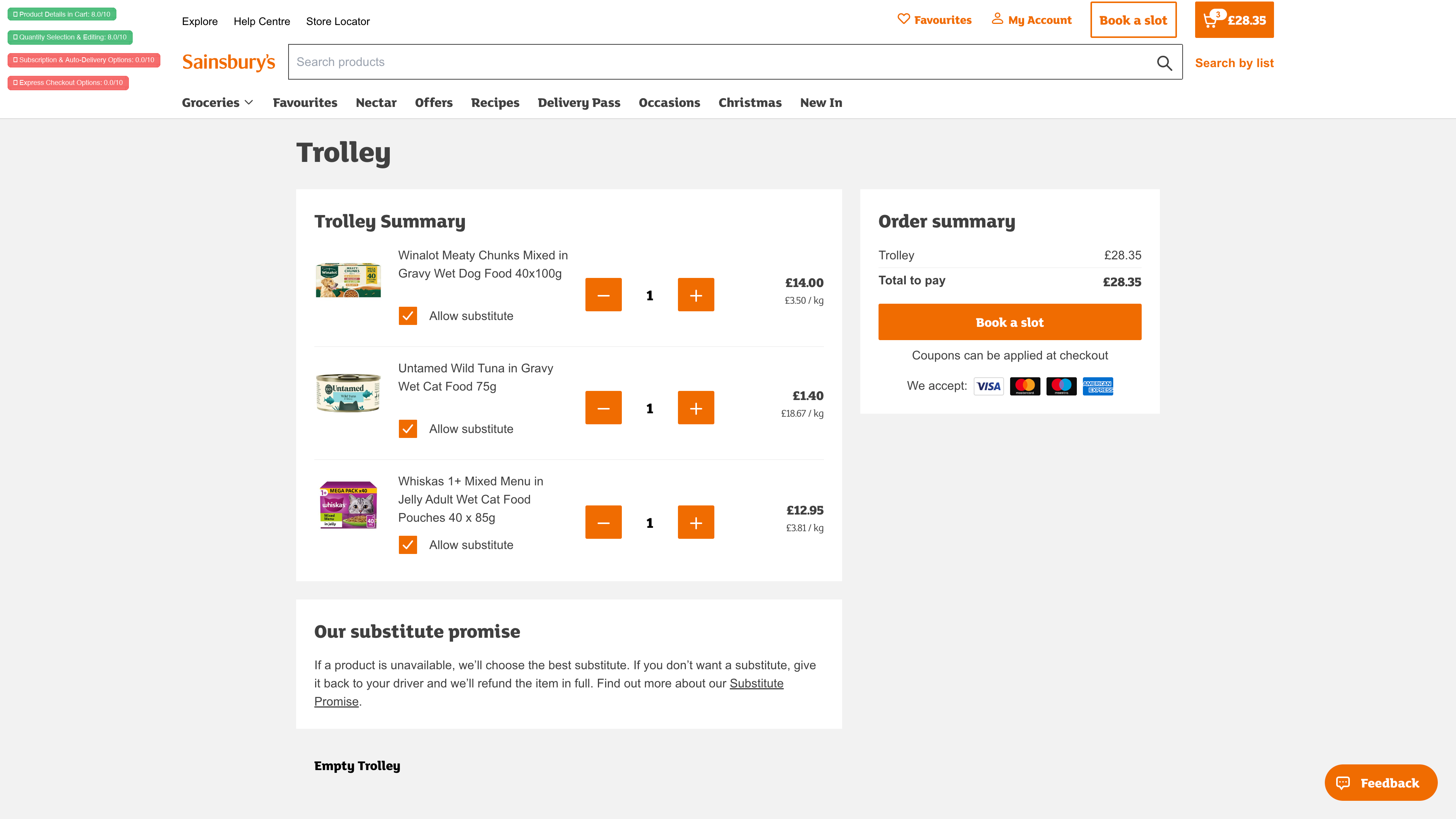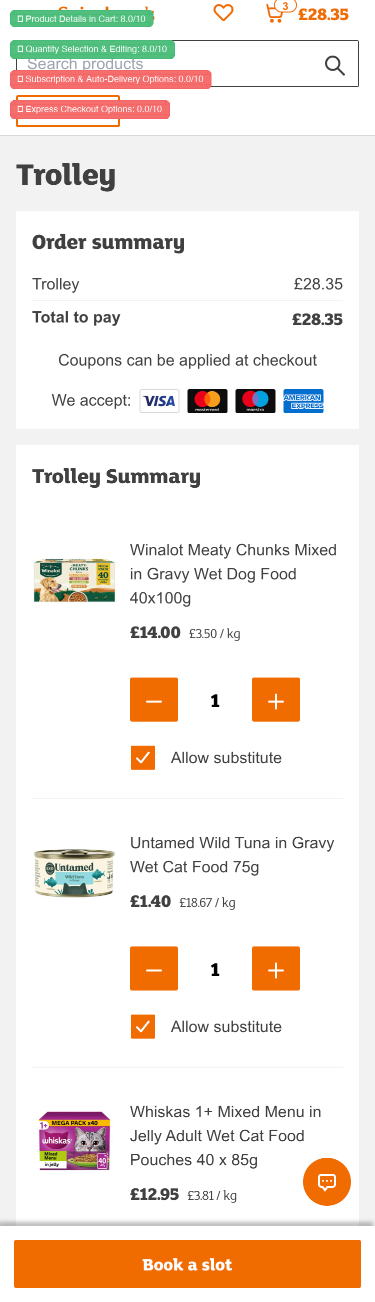 Sainsbury's trolley page shows fundamental weaknesses in delivery transparency and mobile optimization, with minimal integration of retention mechanisms like subscriptions that are standard in modern pet food e-commerce.