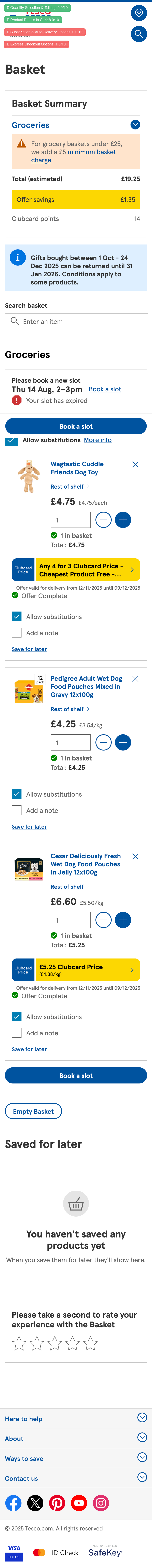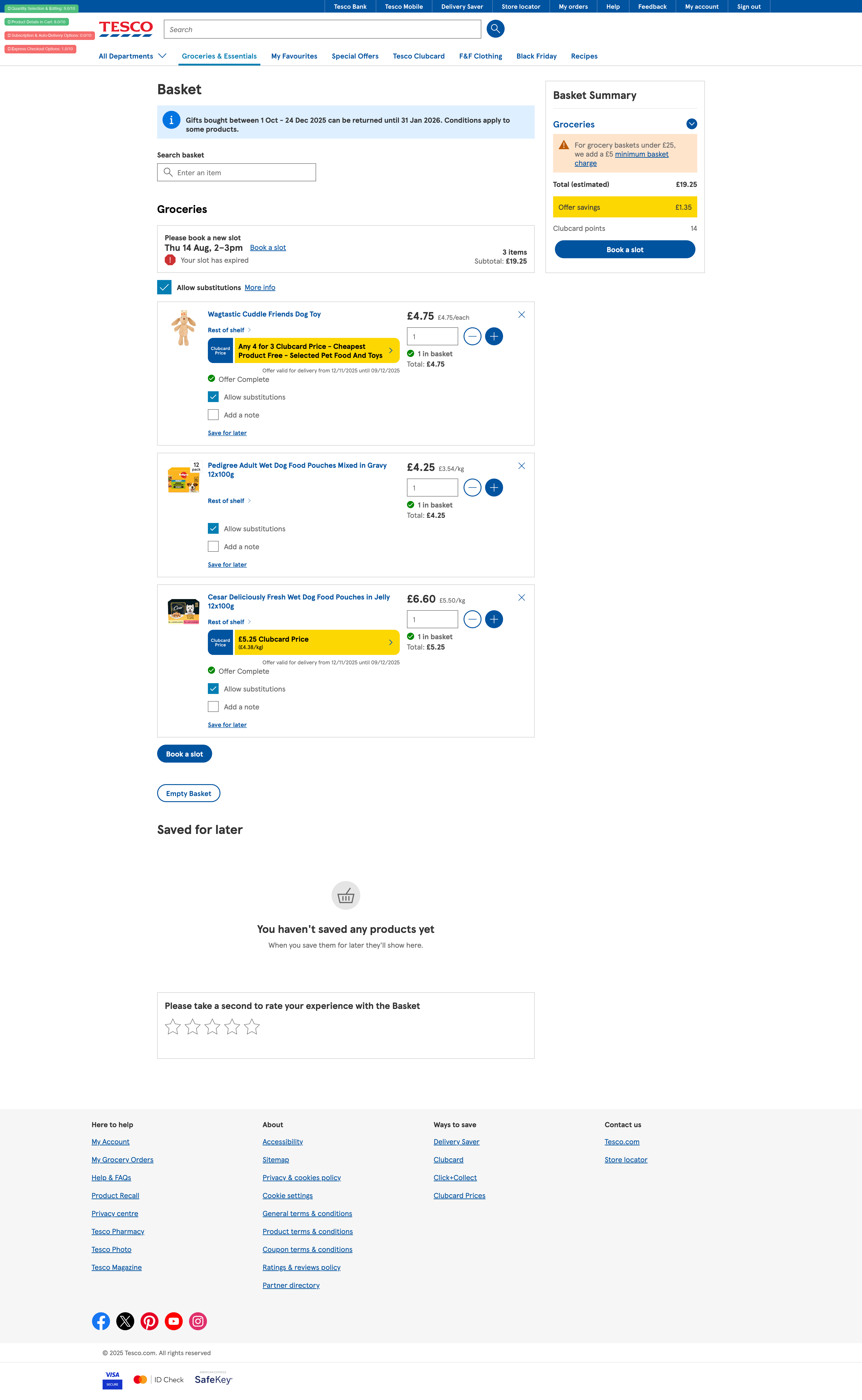 Tesco demonstrates strong fundamentals with clear delivery slot booking, Clubcard pricing integration, and mobile-friendly layout, but lacks critical subscription/auto-delivery features and modern express checkout options that pet-focused competitors are leveraging for customer retention.